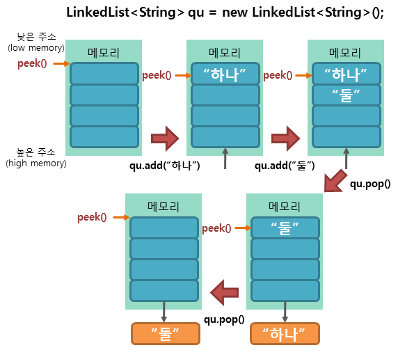 Queue<String> queue = new LinkedList<>(); //String형 queue 선언, linkedlist 이용